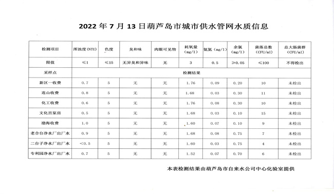 2022年7月13日葫蘆島市城市供水管網(wǎng)水質(zhì)信息