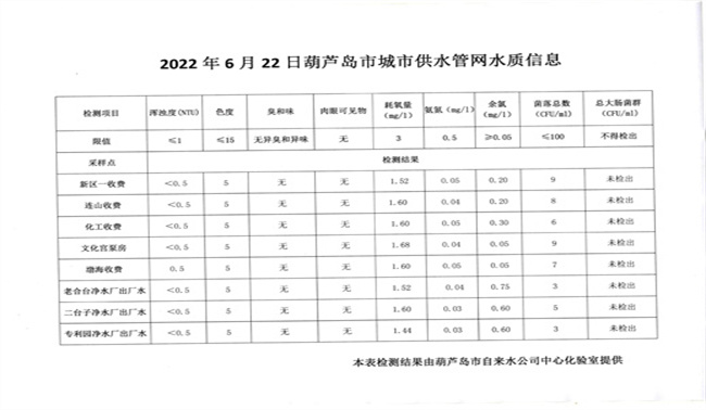 2022年6月22日葫蘆島市城市供水管網(wǎng)水質信息