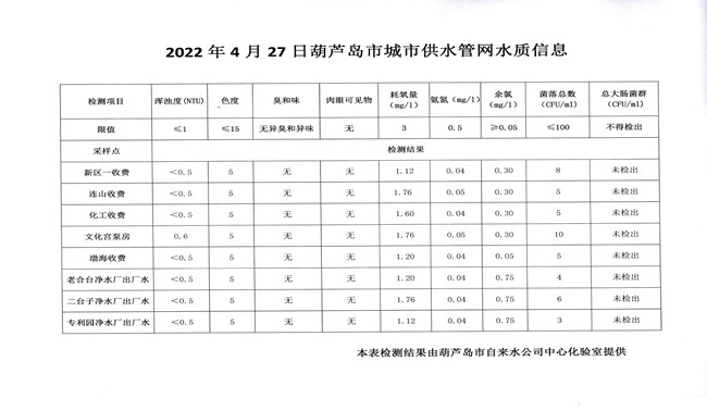 2022年4月27日葫蘆島市城市供水管網(wǎng)水質信息