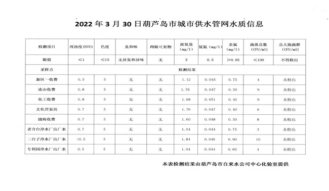 2022年3月30日葫蘆島市城市供水管網(wǎng)水質(zhì)信息