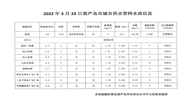 2022年3月23日葫蘆島市城市供水管網水質信息