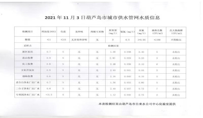 2021年11月3日葫蘆島市城市供水管網水質信息
