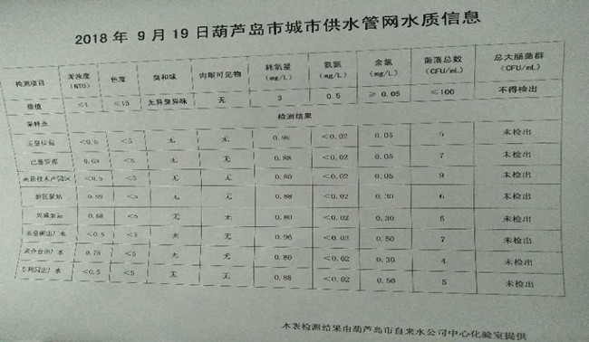 2018年9月19日葫蘆島市城市供水管網(wǎng)水質(zhì)信息