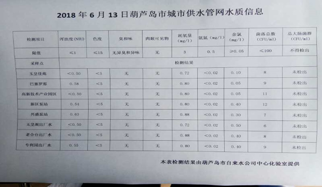 2018年6月13日葫蘆島市城市供水管網(wǎng)水質(zhì)信息