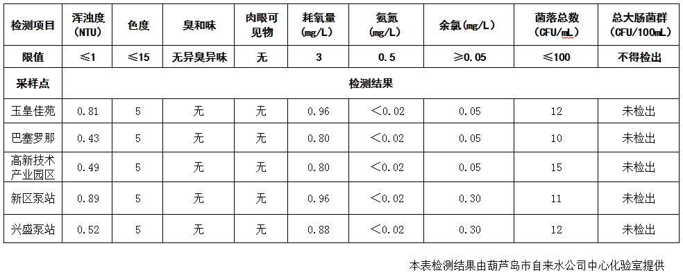 2017年6月15日葫蘆島市城市供水管網(wǎng)水質(zhì)信息