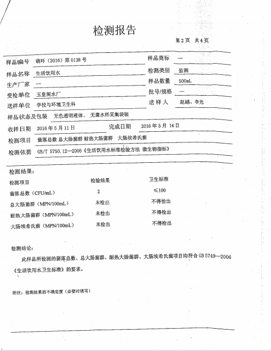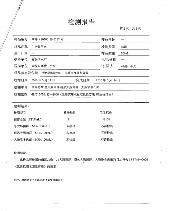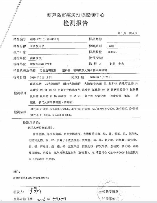 葫蘆島市自來(lái)水公司2016年水質(zhì)檢測(cè)報(bào)告公示