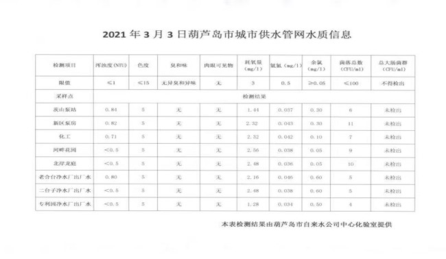2021年3月3日葫蘆島市城市供水管網(wǎng)水質(zhì)信息