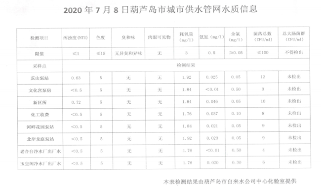 2020年7月8日葫蘆島市城市供水管網(wǎng)水質(zhì)信息