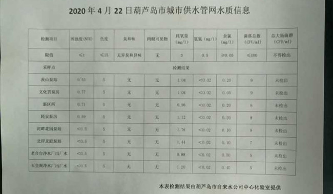 2020年4月22日葫蘆島市城市供水管網(wǎng)水質(zhì)信息