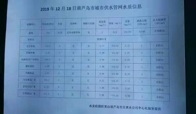 2019年12月18日葫蘆島市城市供水管網水質信息