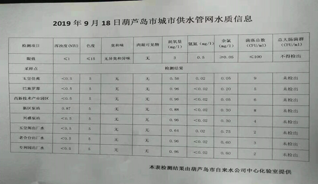 2019年9月18日葫蘆島市城市供水管網(wǎng)水質信息