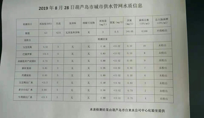 2019年8月28日葫蘆島市城市供水管網(wǎng)水質(zhì)信息