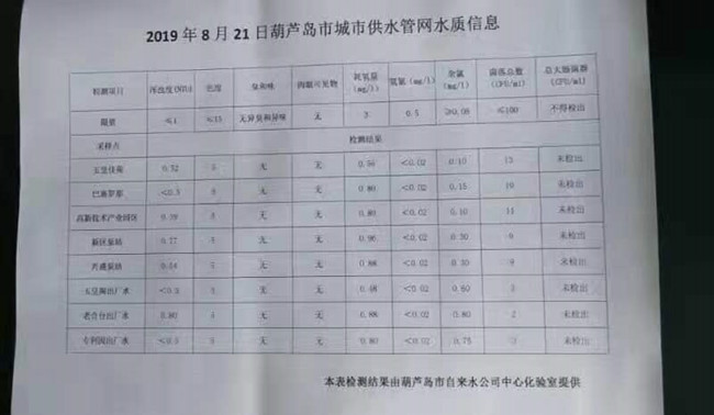 2019年8月21日葫蘆島市城市供水管網(wǎng)水質信息