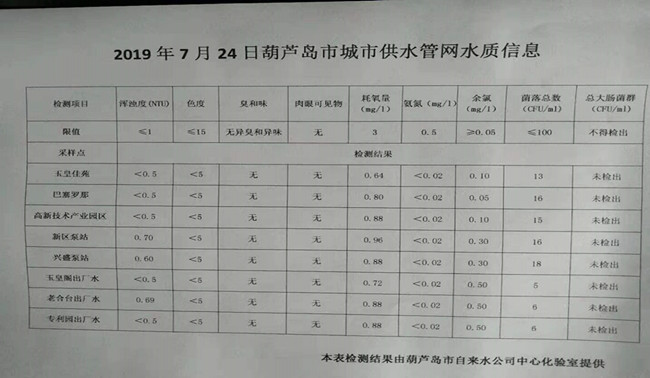 2019年7月24日葫蘆島市城市供水管網(wǎng)水質(zhì)信息