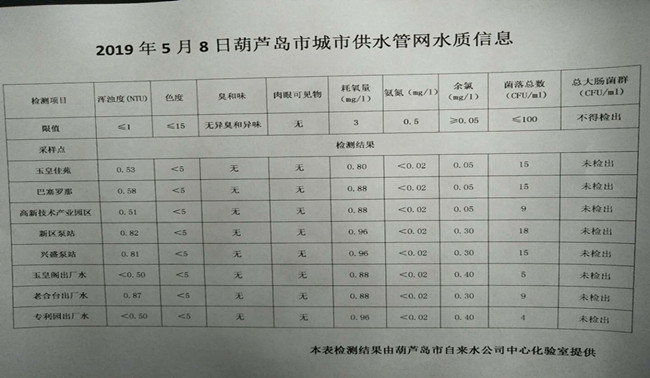 2019年5月8日葫蘆島市城市供水管網(wǎng)水質信息