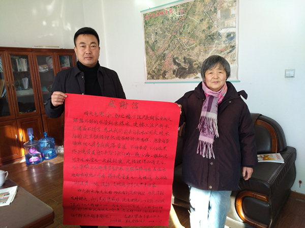 1月30日上午,家住龍港區(qū)望海寺象山社區(qū)3-13棟一單元5樓的一位70多歲的老人在女兒的陪同下,來(lái)到自來(lái)水公司,專(zhuān)程送來(lái)一封熱情洋溢的感謝信,代表全體住戶對(duì)自來(lái)水公司營(yíng)業(yè)三分公司維修人員不辭辛苦,兩次及時(shí)維修被凍損管線,解決該樓用水問(wèn)題及熱情周到的服務(wù)表示感謝。