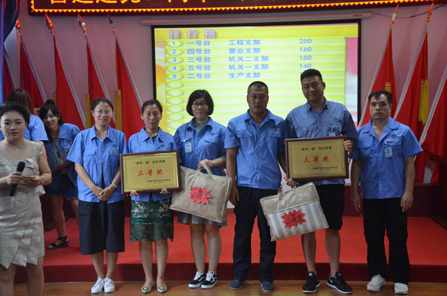 此次競(jìng)賽內(nèi)容包括《黨章》、《廉政準(zhǔn)則》、《習(xí)近平系列重要講話》等知識(shí),公司5個(gè)黨支部集體參加比賽,經(jīng)過(guò)緊張激烈而精彩的角逐,工程公司支部獲得一等獎(jiǎng),機(jī)關(guān)二支部、營(yíng)業(yè)支部獲得二等獎(jiǎng),機(jī)關(guān)一支部、生產(chǎn)支部獲得三等獎(jiǎng)。